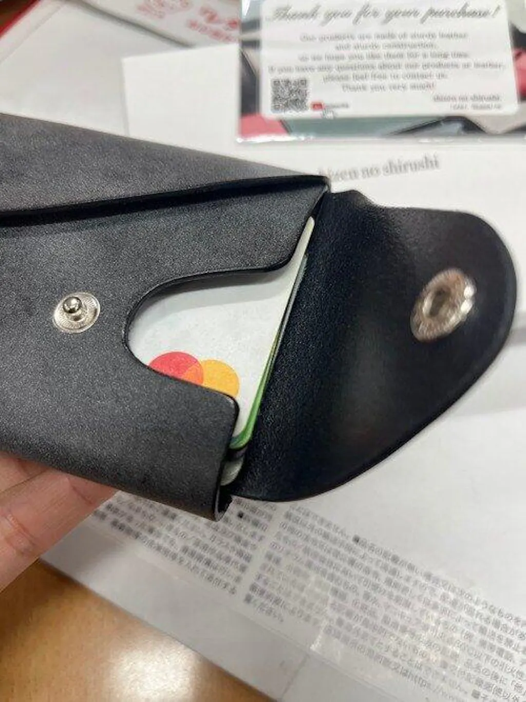 カードをたくさん入れすぎると厚みが出てしまい、ボタンが閉まらなくなります。シンプルな使い方がおすすめです〜。革の表面は滑らかで、革の匂いは比較的控えめで良い感じです。ボタンの音はとてもクリアで、日本製はやはり素晴らしいですね!!